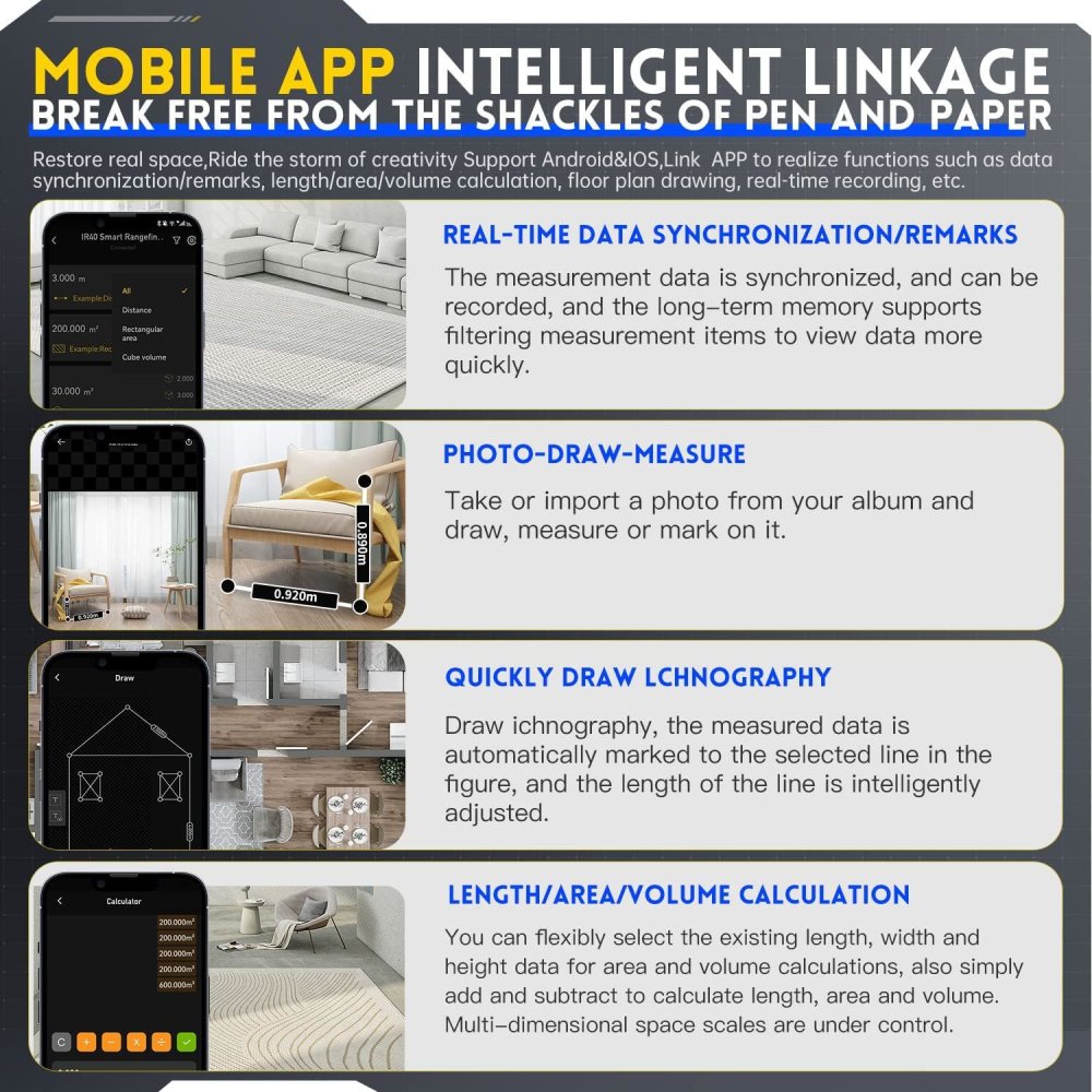- Supports Android and iOS systems and the Link app for functionalities such as data/note synchronization, length/area/volume calculation, floor plans, real-time recording, etc.
