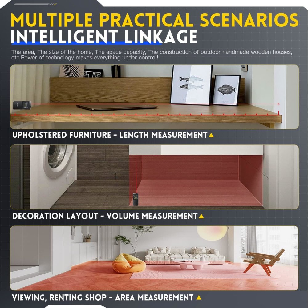 - Versatile functions such as single measurement, continuous measurement, area measurement, volume measurement, Pythagorean theorem, second Pythagorean theorem, front and back reference, and unit switching.