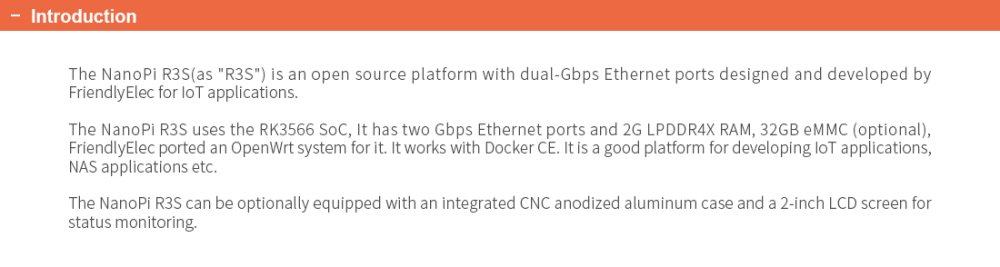The NanoPi R3S is an open-source platform featuring dual Gigabit Ethernet ports based on the RK3566 SoC. It offers two Gigabit Ethernet ports and 2 GB of LPDDR4X RAM, with an option for 32GB eMMC. The device can run OpenWrt and is compatible with Docker CE. It is an ideal platform for developing IoT applications, NAS applications, and other uses.